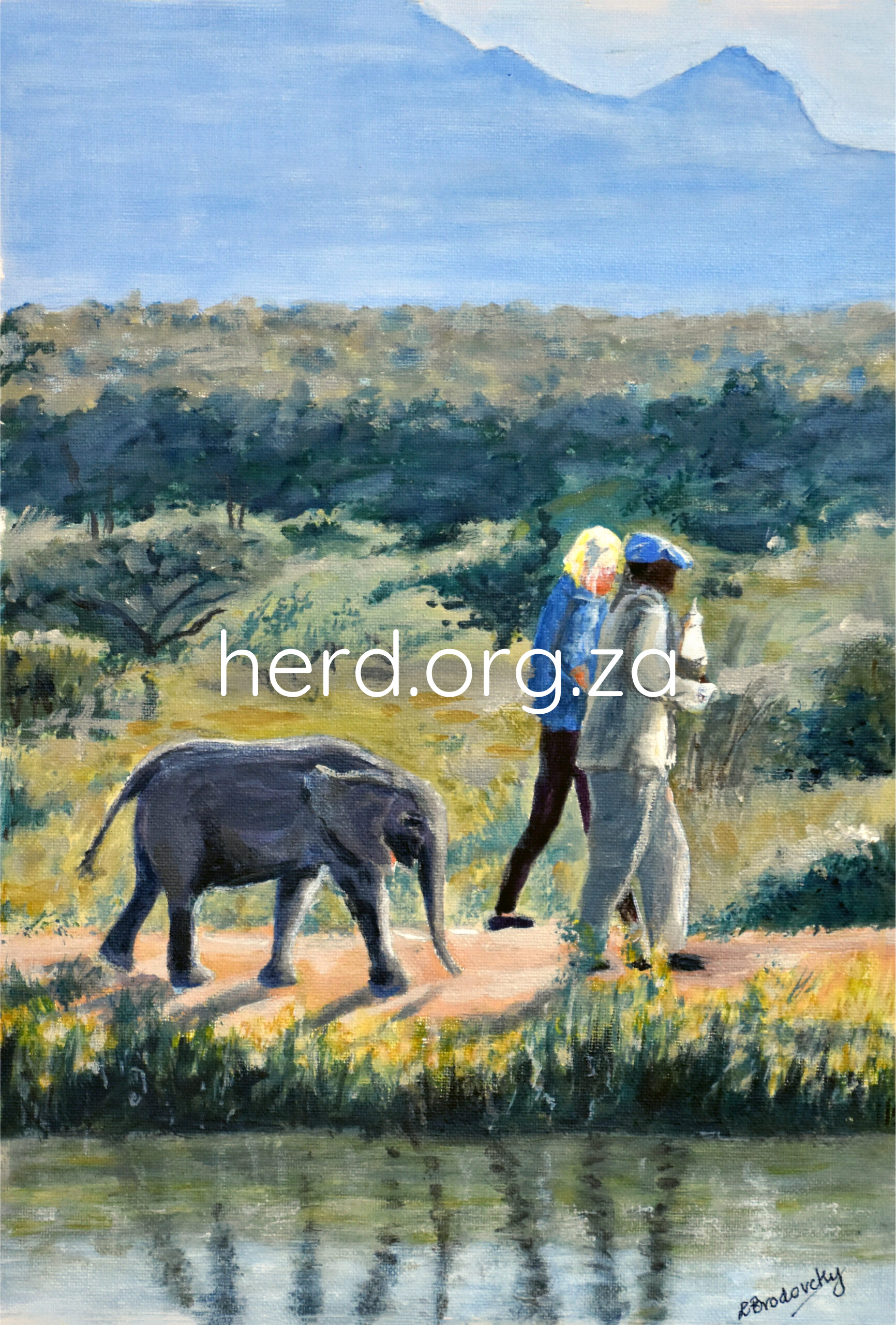 An avid HERD follower, Lyn Brodovcky, has perfectly captured a moment with Adine, Godknows and Khanyisa. The painting is a beautiful depiction of the bond and trust between Khanyisa and her human herd. This took place during Khanyisa’s rehabilitation journey when the team worked around the clock to build up her strength and keep her active. The painting is not only a beautiful work of art, but also a symbol of hope and compassion.
